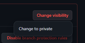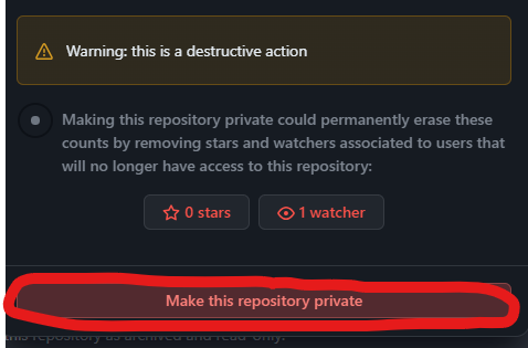 3. 'Change to private' 클릭 → 'I want to make this repository private' 클릭 → 'Make this repository private' 클릭