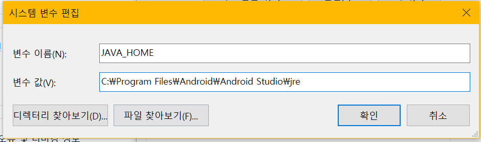 2) 시스템 변수(S)에서 '편집(I)...'을 클릭한 후 변수에 'JAVA_HOME'을 입력하고 값에는 아까 2.에서의 jre/ 경로를 입력한 후 '확인'을 클릭하여 적용한다.