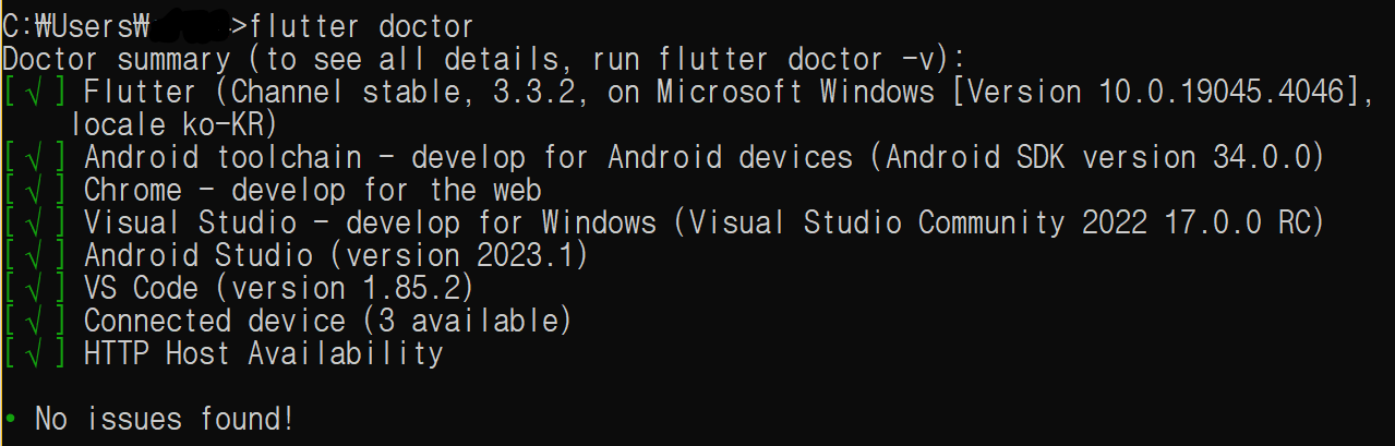 Flutter와 Android Studio를 설치한 후 잘 설치되었는지 확인하기 위해 cmd창에 flutter doctor를 입력했는데 다음 사진과 같이 'Unable to find bundled Java version.(Java 버전을 찾을 수 없다.)'이라는 경고가 떴다.