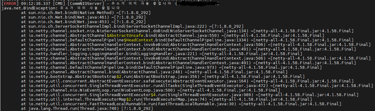 위 에러는 현재 실행한 프로세스의 포트가 이미 다른 데서 사용 중이어서 발생한 에러다.