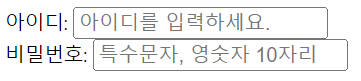 placeholder: 해당 텍스트 박스에 대한 설명을 보여준다. 사용자가 값을 입력하는 순간 글자가 사라진다.