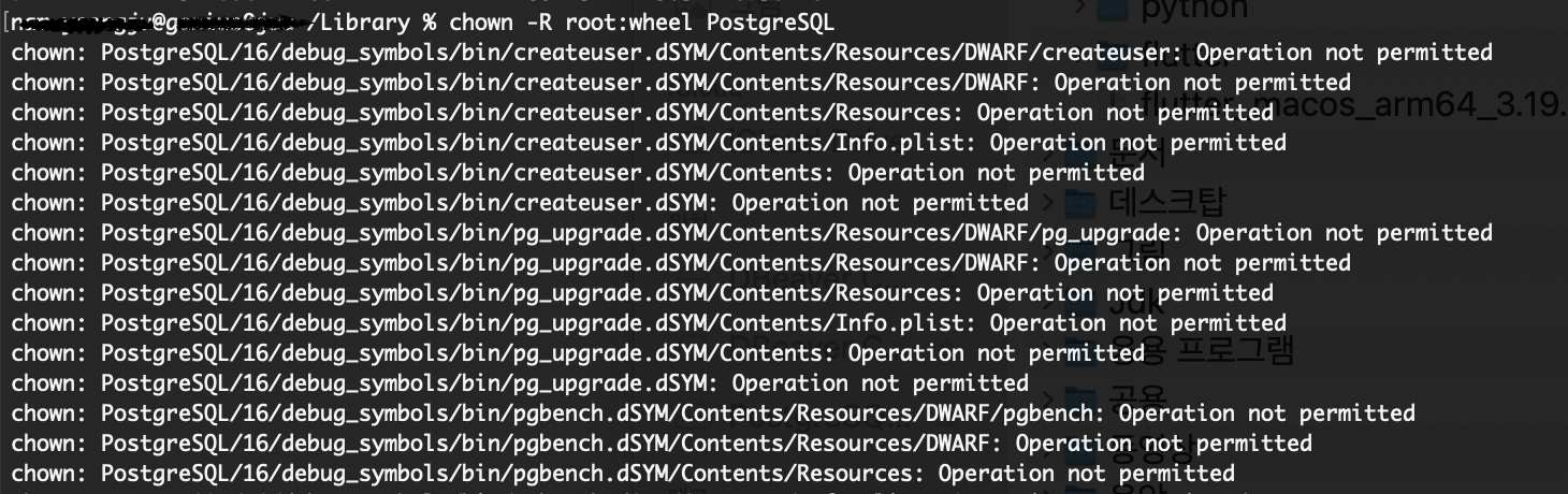 [Unix/Error] Mac 터미널에서 Operation not permitted 에러 발생 맥에서 PostgreSQL 16을 설치하다가 소유자 변경해야 할 일이 생겨 chown 명령어를 사용하였는데, Operation not permitted(허가받지 않은 작업) 에러가 발생하였다.찾아보니 이는 Mac OSX의 시스템 통합 보호(SIP, System Integrity Protection) 때문에 발생하는 문제라고 하여 터미널에 대한 전체 디스크 접근 권한을 ON으로 변경하는 작업을 했다. 1. 좌측 상단의 사과 클릭 -> 시스템 설정 클릭 -> 개인정보 보호 및 보안 클릭 -> 전체 디스크 접근 권한 클릭 2. 터미널을 on으로 변경 이렇게 하면 소유자 변경이 될 줄 알았으나 Operation not permitted 에러는 여전히 발생하였다. 다시 찾아봤더니 root가 아닌 계정으로 소유자 .. OS/Unix 2024.08.25