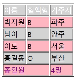 [jQuery] 필터링과 관련된 선택자 및 메소드 필터링 관련 선택자 이름 혈액형 거주지 박지원 B 파주 남이 B 양주 이도 B 서울 홍길동 O 부산 총인원 4명 필터링 관련 메소드 : 기준이 되는 요소 중 특징 요소만 걸러서 선택해준다. - first(), last(), filter(), eq(), not() test-1 test-2 test-3 test-4 test-5 test-6 Programming Language/Javascript, ... 2022.05.01